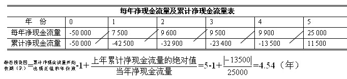 例:某公司準備購入一設備以擴充生產能力,購買該設備花費50 000元,設備使用期5年,經計算在這5奶奶中發生在設備上的每年凈現金流量分別為第一年7 500元,第二年9 600元,第三年9 500元,第四年9 900元,第五年25 000(假設均發生在年末),計算該方案靜態投資回收期?