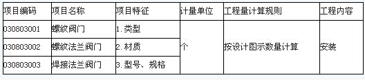 第七、八、九位數(shù)表示各分部工程的各分項工程,即表示清單項目。如030101001為“臺式及儀表機床”;030803001為“螺紋閥門”分項工程。