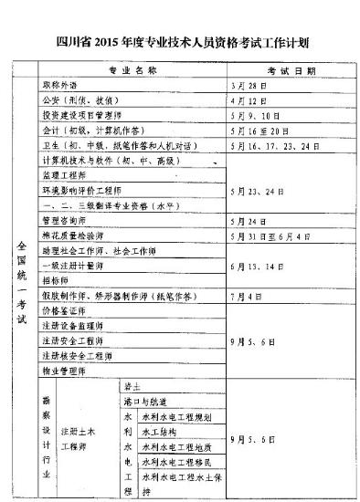 現將四川省人力資源和社會保障廳《關于印發〈四川省2015年度專業技術人員資格考試工作計劃〉的通知》(川人社函〔2014〕1179號)轉發你們,請按照國家和省的計劃,做好相應考試的各項準備工作,采取適當方式進行宣傳,通告有關單位和專業技術人員。