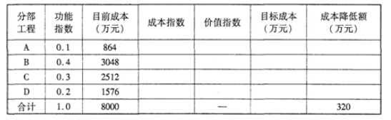 3.假定A、B、C、D四個分部分項工程的目前成本分別為864萬元、3048萬元、2515萬元和1576萬元,目標成本降低總額為320萬元,試計算各分部工程的目標成本及其可能降低的額度,并確定各分部工程功能的改建順序。(將計算結果填入表2.1中,成本指數和價值指數的計算結果保留三位小數)