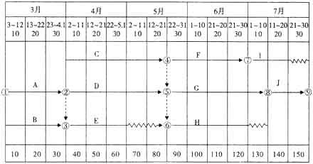 4、某工程項目,業主通過招標方式確定了承包商,雙方采用工程量清單計價方式簽訂了施工合同。該工程共有 10個分項工程,工期150天,施工期為3月3日至7月30日。合同規定,工期沒提前1天,承包商可獲得提前工期獎1.2萬元;工期每托后1天,承包商需承擔逾期違約金1.5萬元。開工前承包商提交并經審批的施工進度計劃.如圖所示。