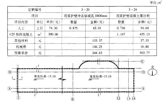 6、某大型公共建筑施工土方開挖、基坑支護、止水帷幕的工程圖紙及技術參數如圖6.I.1“基坑支護及止水帷幕方案平面布置示意圖”圖6.I.2“基坑支護及止水帷幕剖面圖”所示。護坡樁施工方案采用泥漿護壁成孔混凝土灌裝,其相關項目定額預算單價見下表: