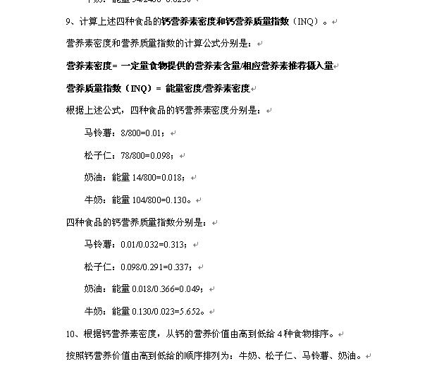 9、計算上述四種食品的鈣營養(yǎng)素密度和鈣營養(yǎng)質量指數(shù)(INQ)。