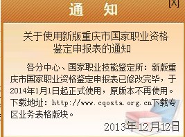環(huán)球網(wǎng)校由重慶市職業(yè)技能鑒定指導(dǎo)中心得知:新版重慶市國(guó)家職業(yè)資格鑒定申報(bào)表已經(jīng)修改完畢,于2014年1月1日起正式使用,原版本不再使用。請(qǐng)點(diǎn)擊附件下載表格: