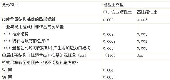必須指出,地基的變形計算,目前還比較粗略。至于地基變形的允許值則更難準確確定。我國規范根據對各類建筑物沉降觀測資料的分析綜合和對某些結構附加內力的計算,以及參考一些國外資料,提出了地基變形的允許值(表7-18)。對表中未包括的其它建筑物的地基變形允許值,可根據上部結構對地基變形的適應能力和使用上的要求來確定。