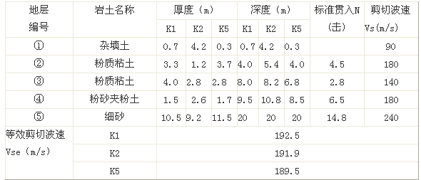 根據《建筑工程抗震設防分類標準》(GB50223―2004),擬建物屬丙類建筑物,建筑場地屬可進行建設的一般場地。根據鄰近場地已有測試資料,場地覆蓋層厚度為25米,屬于3~50米范圍。按照《建筑抗震設計規范》(GB50011-2001)估算深度取20米,根據等效剪切波速估算(見表8),該場地土類型為中軟場地土。依據《建筑抗震設計規范》GB50011-2001表4.1.6,該場地類別為II類。