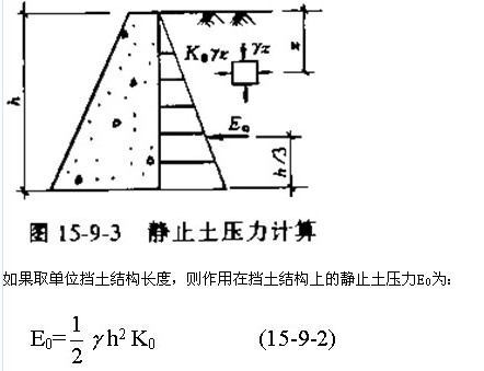 由式(15-9-1)可知,靜止土壓力沿擋土結構豎向為三角形分布,如圖15-9-3所示。