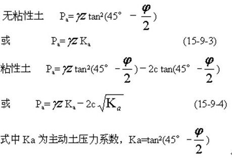 根據擋土墻后地表面下深度z處的應力狀態和土的極限平衡理論,可推導出主動土壓力強度Pa的計算公式如下: