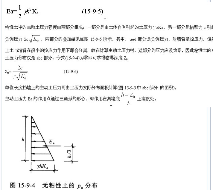 由主動土壓力計算公式可知,無粘性土中主動土壓力強度Pa與深度z成正比,沿墻高的土壓力強度呈三角形分布(如圖15-9-4)。作用在單位長度擋墻上的土壓力為三角形分布面積,即: