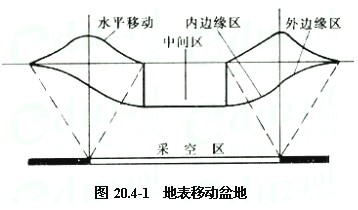 地下礦層大面積采空后,上部巖層失去支撐,產(chǎn)生移動變形,原有平衡條件被破壞,隨之產(chǎn)生彎曲,塌落,以致發(fā)展到使地表下沉變形。地表變形開始成凹陷盆地,此盆地稱為移動盆地。如圖20.4-1所示移動盆地形狀。