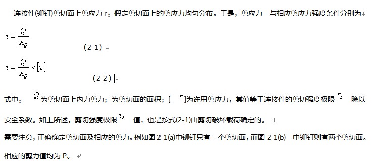 當作為連接件的鉚釘、螺栓、銷釘、鍵等承受一對大小相等、方向相反、作用線互相平行且相距很近的力作用時,當外力過大;其主要破壞形式之一是沿剪切面發生剪切破壞,如圖2-1所示的鉚釘連接中的鉚釘。因此必須考慮其剪切強度問題。