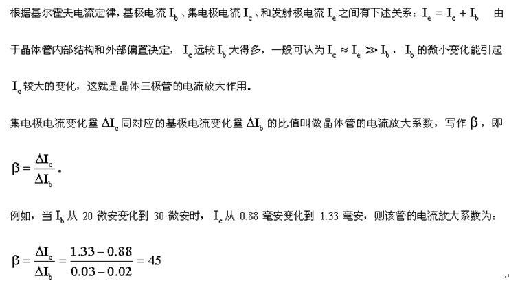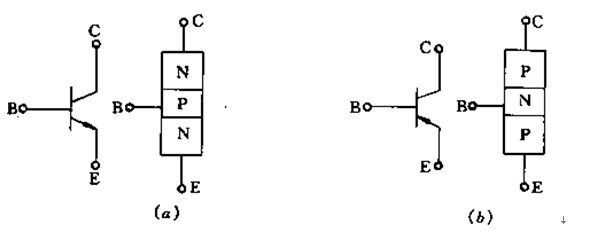 晶體管是由兩個距離很近的PN結(jié)構(gòu)成,必須有三層半導體材料相隔,故此有PNP型和NPN型兩大類。晶體管內(nèi)部有三個區(qū):發(fā)射區(qū)(e區(qū))、基區(qū)(b區(qū))、集電區(qū)(c區(qū)),兩個PN結(jié):發(fā)射區(qū)和基區(qū)之間的發(fā)射結(jié)和基區(qū)與集電區(qū)之間的集電結(jié),還有分別從三個區(qū)引出的三個電極:發(fā)射極、基極和集電極。