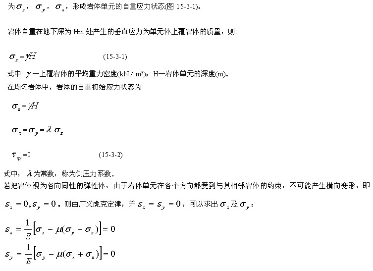 巖體自重應力場的計算,大都是建立在假定巖體為均勻連續介質基礎之上的。因此,可以應用連續介質力學的原理來計算巖體的自重應力場。設巖體為半無限體,地面為水平面,距地表深度為H處,有一單元體,其上作用的應力