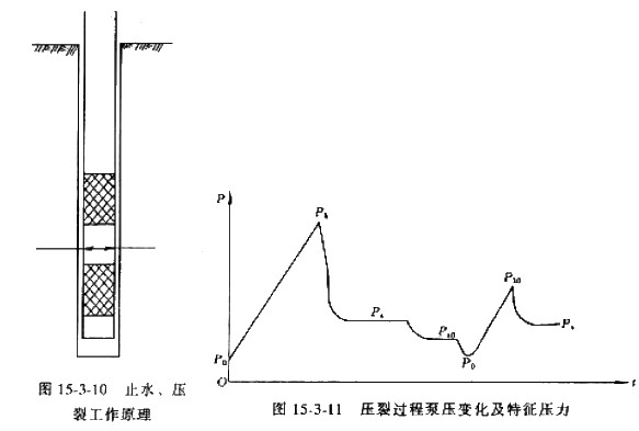 水壓致裂法的基本點是通過液壓泵向鉆孔內擬定測量深度處加液壓。將孔壁壓裂,測定壓裂過程中的各特征點壓力及開裂方位,然后根據測得的壓裂過程中泵壓表頭讀數,計算測點附近巖體中地應力大小和方向。壓裂點上、下用止水封隔器密封,其結構如圖15-3-10所示。水壓致裂過程中泵壓變化及其特征壓力示于圖15-3-11。