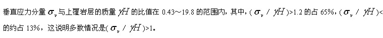 巖體天然應力的垂直分量,一般認為等于該點的上覆巖層的質量 。但從國內實測資料(工程巖體分級標準(GB50216―94)條文說明)看,