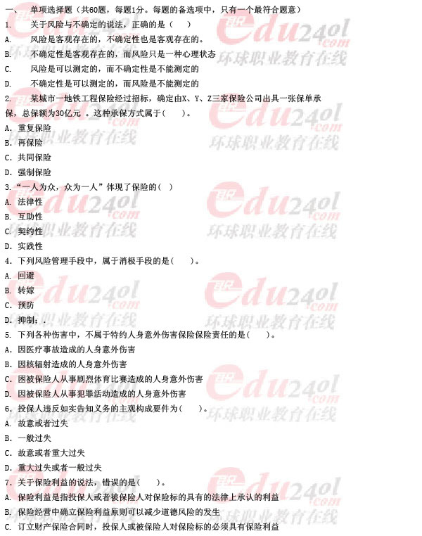 2011年經濟師考試《中級保險》真題及答案(1)