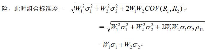 當相關系數為1 時,組合標準離差=(12%+8%)/2=10%;在等比例投資的情況下,相關系數為-1時,組合標準離差=(12%-8%)/2=2%。