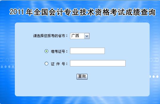 環球網校綜合消息,根據財政部、人力資源社會保障部《關于印發2011年度全國會計專業技術資格考試考務日程安排的通知》,2011年7月20日廣西會計網對外公布了2011年度會計專業技術資格考試成績。請考生登錄查詢,祝愿廣大廣西會計考生朋友都能取得好成績!