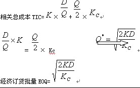 最小相關總成本TIC= 【注意】基本模型中,影響經濟訂貨批量的因素包括K;D, Kc,其中K、D與經濟訂貨批量是同向,Kc與經濟訂貨批量是反向. |