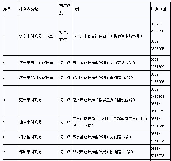 符合報考條件的考生,按照會計從業資格證書屬地原則確認,考生可在本市范圍內選擇相應報名點確認,但不得跨市確認。報考高級會計師考試的人員,統一到濟寧市財政局(市直)報名點進行確認。濟寧市12個縣市區財政局各設置1個報名點。市直、中央(省)駐濟單位、高新技術開發區及北湖度假區的考生到市直報名點進行現場確認。報名確認地點如下: