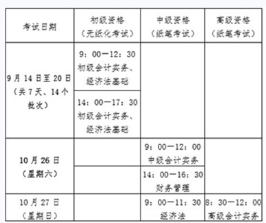 初級資格無紙化考試于9月14-20日舉行;中級資格、高級資格考試于10月26-27日舉行。初級資格《初級會計實務》科目的考試時間調整為2小時,《經濟法基礎》科目的考試時間調整為1.5小時,兩個科目考試時間共計3.5小時;兩個科目連續考試,分別計算考試成績。