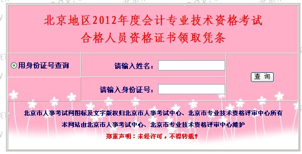 摘要 北京地區2012年度會計專業技術資格考試合格人員資格證書領取憑條開始查詢,考生可以通過下面鏈接進入頁面。