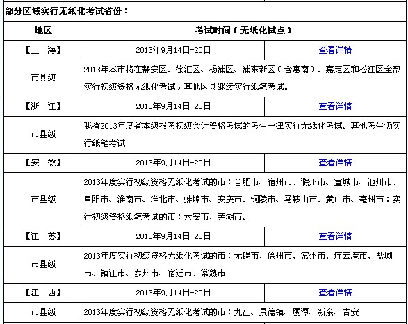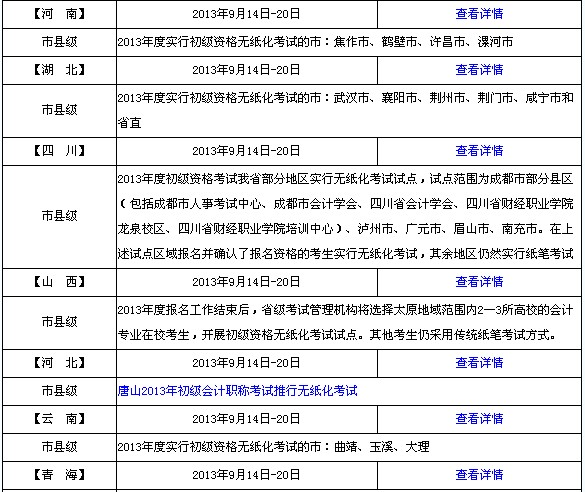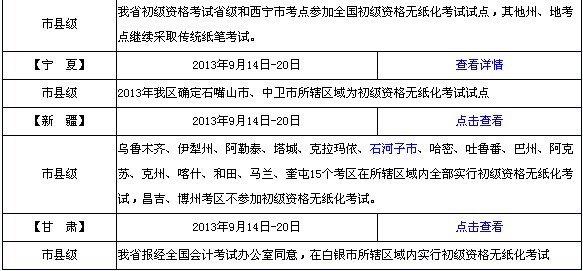 2013年初級會計職稱無紙化考試試點范圍和批次等相關情況,同意北京市、天津市、遼寧省、吉林省、黑龍江省、福建省、山東省、湖南省、廣東省、廣西壯族自治區、海南省、重慶市、貴州省、西藏自治區、陜西省等15個省(市、自治區)及新疆生產建設兵團在所轄區域內全部實行無紙化考試,其他地區在本地區的部分區域實行無紙化考試。詳情如下表所示: