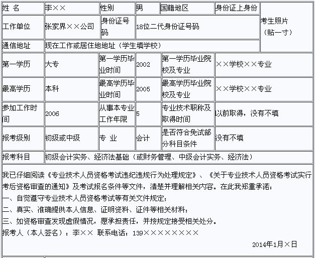 張家界2013年中級考試登記表填寫樣表及資格審查常見問題解答