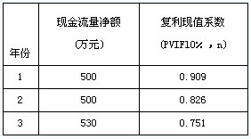 甲公司為項(xiàng)目運(yùn)營(yíng)于2009年1月1日購(gòu)人一臺(tái)設(shè)備,設(shè)備原值630萬(wàn)元,預(yù)計(jì)可使用3年,按直線法計(jì)提折舊,預(yù)計(jì)凈殘值30萬(wàn)元。該設(shè)備于購(gòu)人當(dāng)日投入運(yùn)營(yíng)。該項(xiàng)目投入運(yùn)營(yíng)后,各年的現(xiàn)金流量?jī)纛~及復(fù)利現(xiàn)值系數(shù)如下表:
