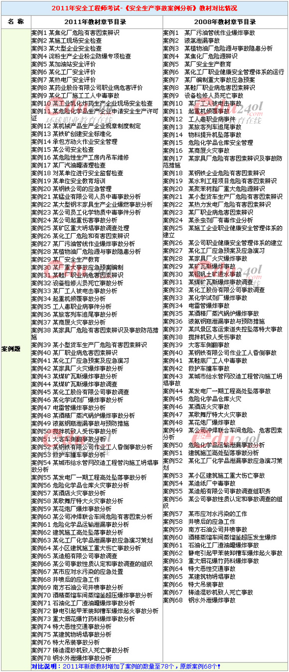 環球網校(www.edu24ol.com)消息,2011年安全工程師考試教材及大綱已經公布,為了讓廣大更加醒目的了解到新教材變化,網校現將2011年教材的變化情況進行了整理和對比。2011年安全工程師考試-《安全生產事故案例分析》教材對比情況如下:
