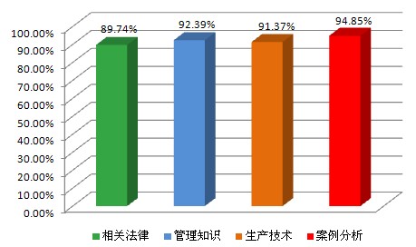環球網校2011年度安全工程師考試輔導通過率情況為:《安全生產法及相關法律知識》89.74%、《安全生產管理知識》92.39%、《安全生產技術》91.37%、《事故案例分析》94.85%,全科通過率83.18%,各科通過率遠遠高于安全工程師考試的全國通過率。