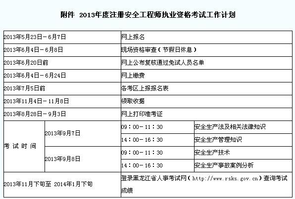 2013年度注冊安全工程師執業資格考試由省人事考試中心統一在哈爾濱市設置考場,其他市(地)不設考場。