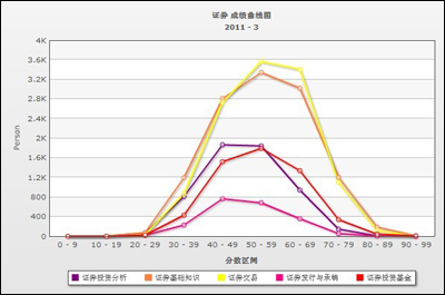 證券從業(yè)資格考試難度的提高,無疑是大大的加高進(jìn)入證券行業(yè)的門檻,旨在提高證券從業(yè)人員整體隊(duì)伍的職業(yè)水平。從證券從業(yè)資格考試成績曲線分布圖可以看出,證券交易和證券基礎(chǔ)知識是考生們首選的考試科目,這主要取決于證券基礎(chǔ)知識是必考的科目,而證券交易難易度較為適中,這兩個科目通過之后獲得的證券從業(yè)資格證書可以從事證券公司較為基礎(chǔ)的交易工作,就業(yè)范圍較廣。