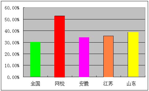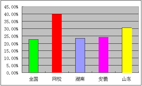除開未參加考試的學員,在合計的總體通過率中,全國的水平為22.78%,網校的水平為39.99%,高于湖南的23.58%、安徽的24.35%、山東的30.66%。