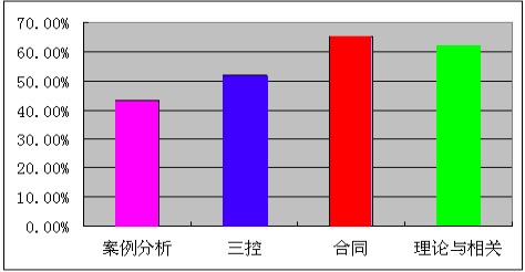 1. 單科通過率:案例分析43.24%,三控52%,合同65.21%,理論與相關62.07%。