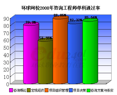 環球網校2008年咨詢工程師輔導各科通過率分別為:《工程咨詢概論》79.9%,《宏觀經濟政策與發展規劃》58.35%,《工程項目組織與管理》88.85%,《項目決策分析與評價》82.32%,《現代咨詢方法與實務》85.56%。