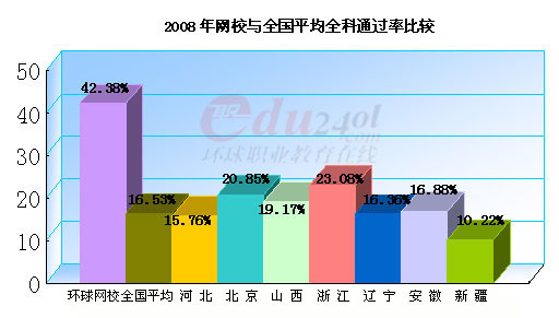 全國全科通過情況:2008年全國報考全科的平均通過率為16.54%,該比率在全國其他部分地區為河北15.762%、北京20.85%、山西19.17%、浙江23.08%、遼寧16.36%、安徽16.88%、新疆10.22%。環球網校全科通過率為42.38%,是全國平均水平的將近3倍,地方水平的兩倍以上。
