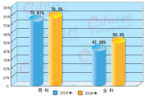 全國兩科通過情況:2009年全國報考兩科的平均通過率為32.98%,部分地區的通過率為北京34.54%、河北41.72%、山西35.51%、浙江32.54%、遼寧32.54%、安徽41.96%、新疆25.81%。環球網校兩科通過率為79.3%,遠遠高于全國各地的考試通過率。