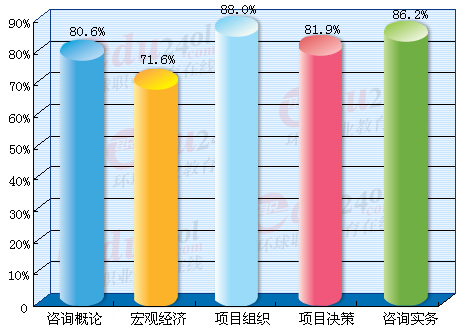 環球網校2009年咨詢工程師輔導各科通過率分別為:《工程咨詢概論》80.6%,《宏觀經濟政策與發展規劃》71.6%,《工程項目組織與管理》88.0%,《項目決策分析與評價》81.9%,《現代咨詢方法與實務》86.2%。