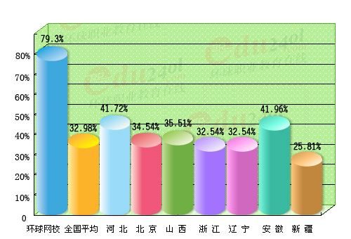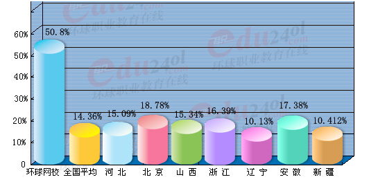 全國全科通過情況:2009年全國報考全科的平均通過率為14.36%,該比率在全國其他部分地區為河北15.09%、北京18.78%、山西15.34%、浙江16.39%、遼寧10.13%、安徽17.38%、新疆10.412%。環球網校全科通過率為50. 8%,是全國平均水平的3倍以上。