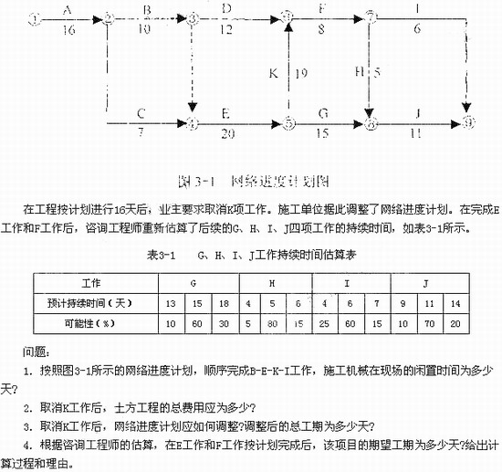 某工程項目合同上期為89天,網絡進度計劃如圖3-1所示。其中,B、E、K、I四項工作均為土方工程,需安排同藝臺士方施工機械先后順序施上,土方工程量分別估算為1100m3、2300m3、1600m3和800m3,土方綜合單價為18元/m3。合同規定,土方工程量減少不超出原估算工程量的20%時,按原約定價格計價;減少量超出20%時,全部土方工程量按19元/m3計價。