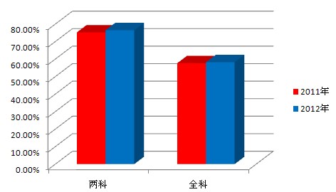 全國兩科通過情況:2012年全國報考兩科的平均通過率為14.22%,部分地區的通過率為北京18.33%、河北28.45%、山西21.28%、浙江21.16%、遼寧17.81%、安徽32.23%、新疆14.29%。環球網校兩科通過率為76.52%,遠遠高于全國各地的考試通過率。