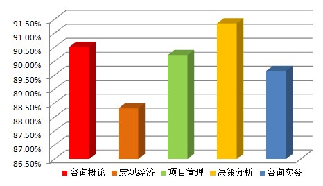 環球網校2012年咨詢工程師輔導各科通過率分別為:《工程咨詢概論》90.51%,《宏觀經濟政策與發展規劃》88.31%,《工程項目組織與管理》90.22%,《項目決策分析與評價》91.35%,《現代咨詢方法與實務》89.65%。