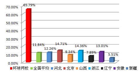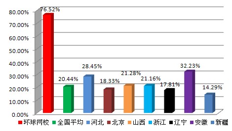 全國全科通過情況:2012年全國報考全科的平均通過率為11.84%,該比率在全國其他部分地區為河北12.26%、北京14.71%、山西9.34%、浙江14.36%、遼寧7.89%、安徽13.01%、新疆5.51%。環球網校全科通過率為65.79%,是全國平均水平近4倍之多。