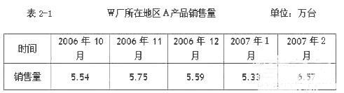 W廠生產的A產品目前的市場份額與最大競爭對手的市場份額的比率(相對市場份額)為1.2,市場成長率為14%。鑒于目前的市場態勢,該廠擬調整2007年二季度的生產計劃。為此,委托Y咨詢公司對該廠所在地區的A產品銷售量進行預測。Y公司根據本公司目前僅有的行業統計信息庫,統計了W廠所在地區2006年10月。2007年3月的A產品銷售量,見表2-1.