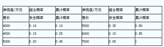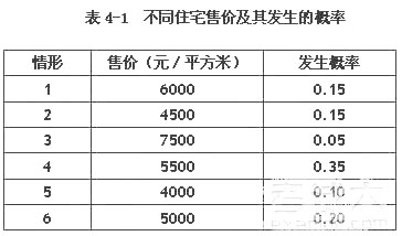 3.丙咨詢工程師通過敏感性分析得知項目效益對住宅價格很敏感,當住宅平均售價為5200元/平方米時,項目的內部收益率等于開發商期望的最低回報率(12%)。丙咨詢工程師分析了不同住宅售價發生的概率,如表4-1所示: