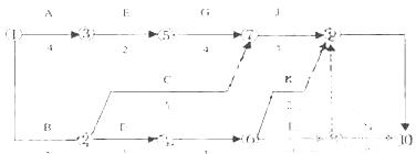 2.(1)需要安排虛工作才能使甲工程師按A→I→J順序工作,調整進度計劃如下圖(也可以不畫圖,直接用文字描述,如在A工作之后、I工作之前增加一項虛工作③一④等):