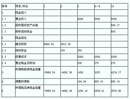 點評:項目投資現金流量表的填寫一定要注意按每年計算相關數據,哪些數據什么時間發生很重要,如建設投資、流動資金等分年投入;這里的調整所得稅是《方法與參數》新變化的內容,一定要熟記計算公式。還要注意的是這里的固定資產原值按建設投資數據計算。