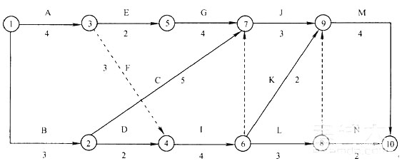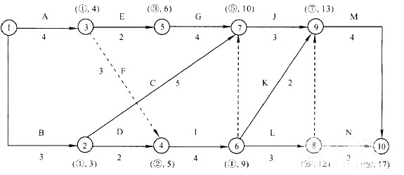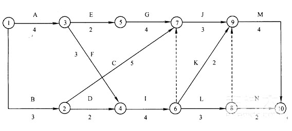 主要的工作線路有:A-E-G-J-M,17周;A-F-I-J-M,18周;A-F-I-K-M,為17周;A-F-I-L-M,18周;A-F- I-L-N,16周;B-C-J-M,15周;8-D-I-J-M,16周;8-D-I-K-M,15周;8-D-I-L-M,16周;B-D-I-L- N,14周。