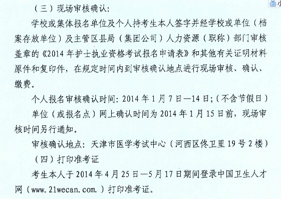 摘要 天津2014年執業護士考試報名時間為2013年12月25日至2014年1月12日,現場確認時間為2014年1月7日至14日。